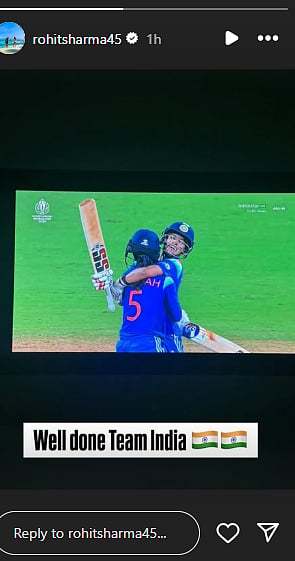 Rohit Sharma took to social media to hail India’s historic triumph as the women’s team stormed into the ICC Women’s World Cup 2025 final after a memorable 5 wicket win over Australia at the Dr DY Patil Sports Academy in Navi Mumbai on Thursday. Rohit share dthe screenshot of Jemimah hugging Amanjot after she scored thewinningruns. He captioned the post ' Well Done India