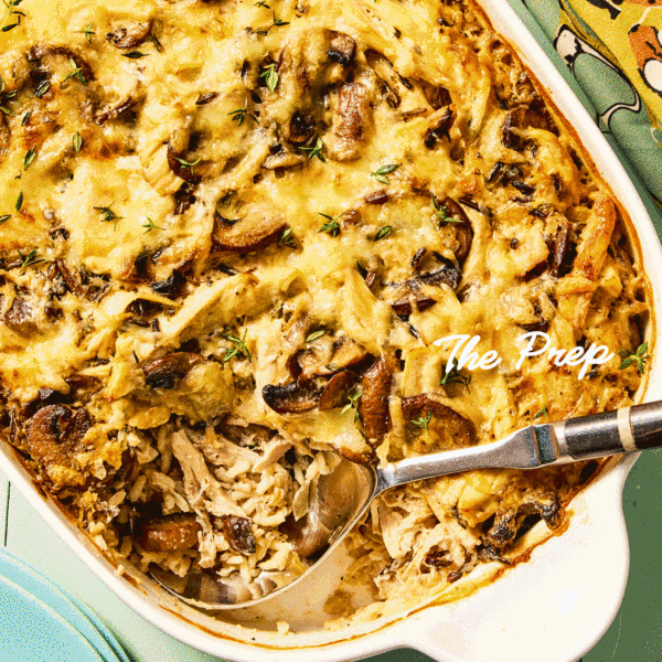 Using rotisserie chicken gets this creamy casserole on the table without much fuss. Most of it comes together right in the baking dish; you’ll just need to sauté the mushrooms separately to drive out their moisture so the casserole won’t be soggy. The chicken is an excellent source of protein, and the mushrooms contribute fiber to help support your gut health and antioxidants to help reduce inflammation.
