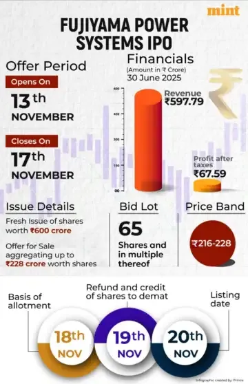 The public issue opened for subscription on November 13, and will close on November 17. Fujiyama Power Systems IPO allotment date is likely November 18, and the IPO listing date is November 20. Fujiyama Power Systems shares will be listed on BSE and NSE.