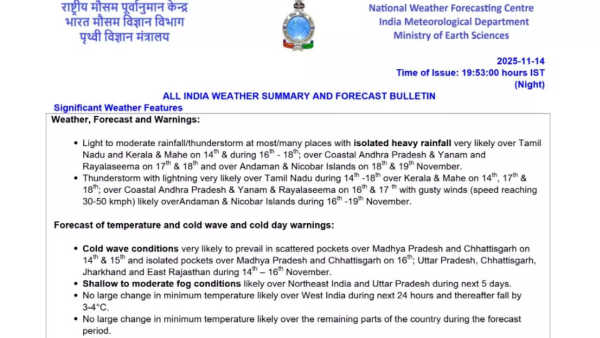 A combination of active weather systems over the Bay of Bengal and northern parts of India is set to bring a mixed spell of heavy rain, thunderstorms, chilly winds and dense fog across several regions over the next few days. The (IMD) latest bulletin indicates that southern states will see a surge in rainfall activity from November 16–18, while parts of central and north India brace for cold wave conditions as temperatures continue to dip.