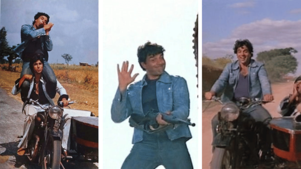 In this film, Dharmendra donned block-coloured, well-pressed shirts with sleeves rolled up, paired with classic kolhapuri sandals or juttis. This look blends ethnic charm with street-smart simplicity and comfort. Adding a red scarf around the neck adds a stylish flourish that stands out.