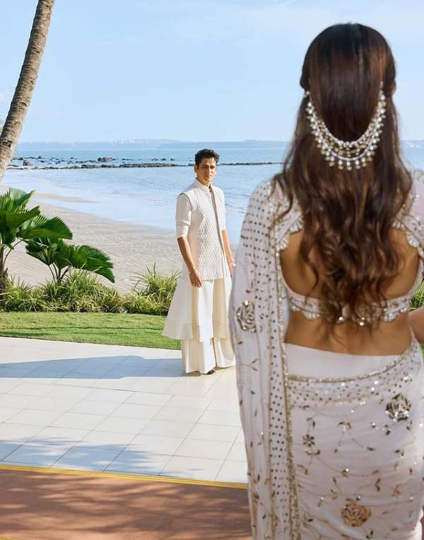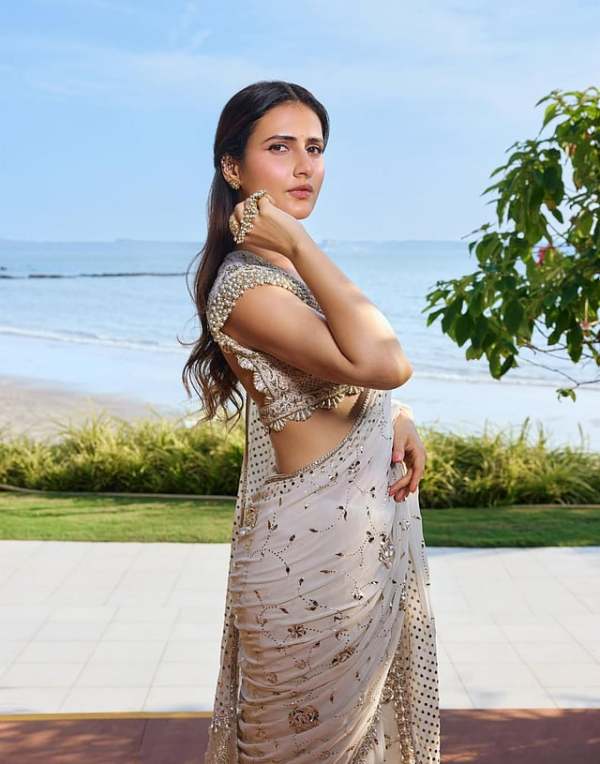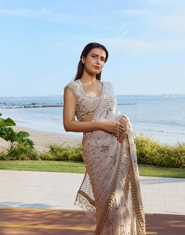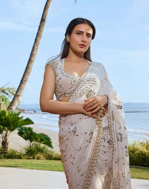 Fatima was wearing an Ivory saree with metallic embellishments. Adorned with sequins, beads, and metallic rose motifs that add a luxe sheen under the sun