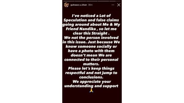 After listening to the rumours online, choreographer Gulnaaz sent a public message via her Instagram stories, indicating that neither she nor Nandika were involved in the scene. She emphasized if someone is a friend socially or happens to be photographed with a person then that should not be taken as a linkage to their personal affairs. She also urged social media users not to reach conclusions without having the facts beforehand.
