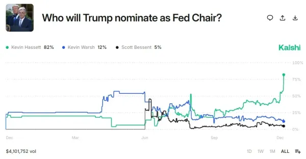 Data from Kalshi shows an 82% probability that Hassett will emerge as the Fed Chair pick. Participants on Polymarket were slightly less optimistic, with data indicating a 58% probability that Hassett would be picked as the Fed Chair at the time of writing.