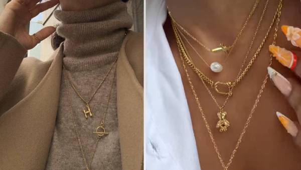 Layered gold chains are a big trend this winter. Wearing thin and medium chains of different lengths together gives a modern and rich look. This design also looks great with sweaters, high-necks and coats.