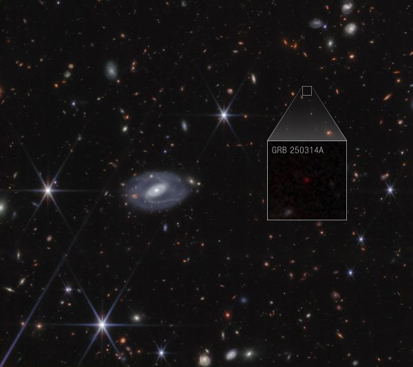 GRB 250314A with its host galaxy. (Image Credit: NASA, ESA, CSA, STScI, A. Levan (IMAPP), Image Processing: A. Pagan (STScI)).