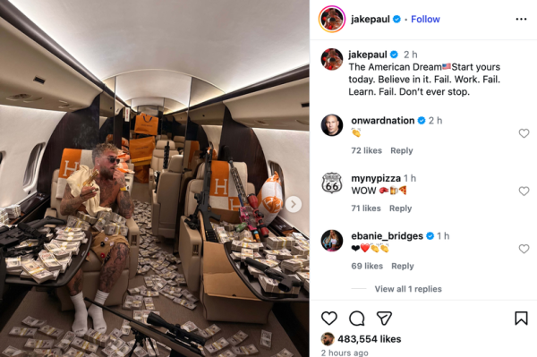 "The American Dream [US flag emoji]. Start yours today. Believe in it. Fail. Work. Fail. Learn. Fail. Don’t ever stop," wrote Paul, who could be seen holding a gold-plated magnum whilst smoking a cigar.
