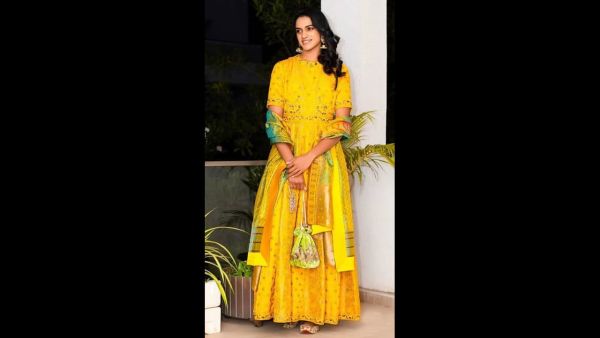 If you want a premium look in your wedding, then Kalidaar golden embroidery suit set is the best option. Carry it with a net dupatta like PV Sindhu. Flowy movement will look graceful with tall height.