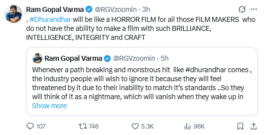 Taking to his X (formerly Twitter) handle, RGV wrote, “Whenever a pathbreaking and monstrous hit like #dhurandhar comes, the industry people will wish to ignore it because they will feel threatened by it due to their inability to match its standards.”