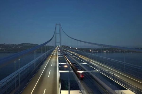 The colossal bridge, consisting of two towers stretching 400-metres (1,300 feet), would span an incredible 3.3km (2.05 miles). Three lanes of traffic would sit either side of two railway lines in the middle.