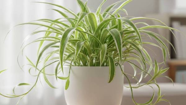 Spider plant is known for its unique leaves and air purifying properties. It can be grown in water and kept near a window or on a table. This plant grows well with little care and makes the home feel fresh and vibrant.