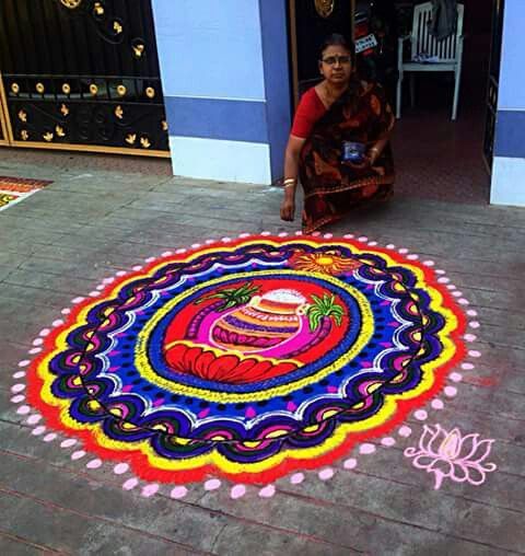 Creative Kolam designs for Pongal 2026Centre a traditional earthen pot overflowing with rice and sugarcane, encircled by simple dot patterns and rising sun rays. This beginner-friendly design symbolises abundance; use white rice flour with red-yellow accents for vibrancy. Ideal for Kannum Pongal thresholds, it takes 15 minutes and invites prosperity. Perfect for first-timers seeking authentic Pongal kolam designs 2026.