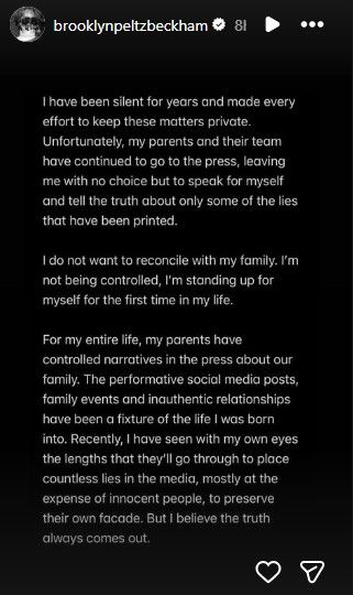Brooklyn on Monday took to Instagram Story and released a lengthy statement, explaining why he does not want to reconcile with his family.