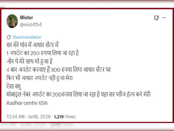 "Sir, the Aadhaar center in my village is charging 200 rupees for an Aadhaar update. The same thing happened to me. I got it updated four times, for which the Aadhaar center charged me 800 rupees, but the Aadhaar was still not updated." A user posted this complaint on social media, after which the UIDAI clarified the situation. The user did not provide their name, address, or village name, but mentioned the Aadhaar center number as 656. The user said, "Please help me." Following this, the Unique Identification Authority of India (UIDAI) shared complete details about Aadhaar updates.