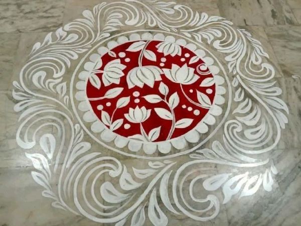 Circular frame packed with interlocking flowers, vines weaving through like spring creepers. Central starburst for Saraswati’s light—dot-to-dot method keeps it foolproof. Evokes abundance and growth; stunning under puja lights. Newbies spin from the middle out, no perfection needed—it’s hypnotic flow makes any floor festival-ready in under 15 minutes.