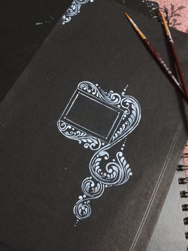 Sketch open books stacked centrally, pages fanning with intricate lines like ancient scripts. Border with geometric swirls for balance—use finger or twig for precision. Ties to Saraswati’s learning aura, blessing exams ahead; suits student homes. Beginners outline rectangles first, fill playfully—turns puja space scholarly without complexity, and it’s surprisingly meditative to create.