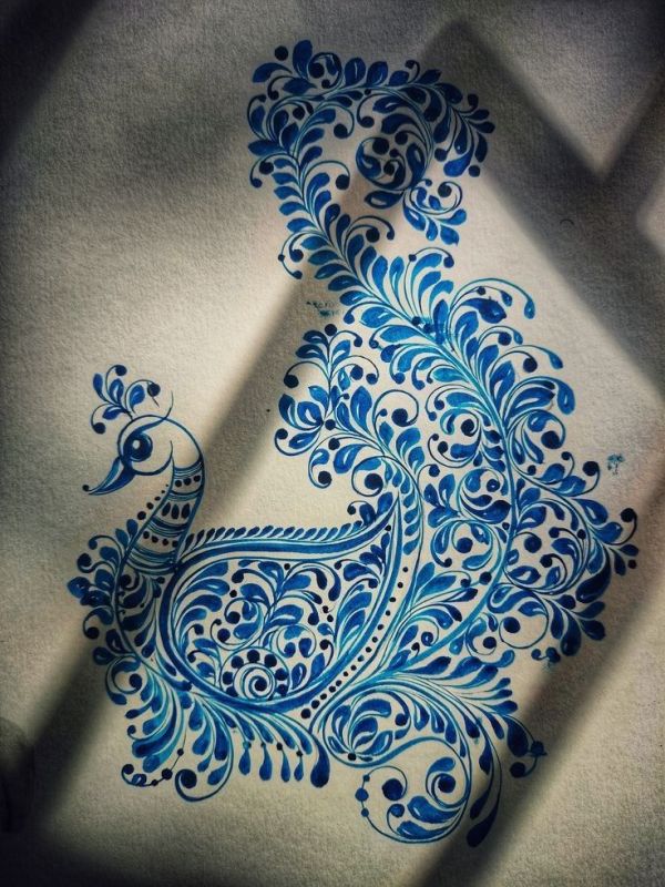 Start with a central, elegant swan, Maa Saraswati’s ride, its neck curving like a question mark, ready for knowledge quests. Surround it with layered feathers in flowing lines using rice paste—super simple for beginners, just freehand curves from a big circle. This design symbolises purity and grace, inviting the goddess to glide in; even kids can join by dotting the eyes. Takes 10 minutes but looks like hours of effort, perfect for puja entrances.