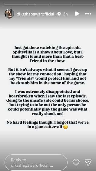 Diksha wrote, "Just got done watching the episode. Splitsvilla is a show about Love, but I thought I found more than that a best-friend in the show." She further indirectly called out Yogesh and Akanksha saying that he gave up her connections believing that her friends will save him (Himanshu)." Diksha then added, "...Hoping that my "friends" would protect him and not back-stab him in the name of the game (sic)."