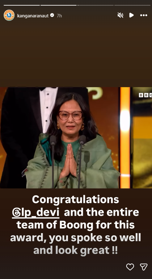 Kangana took to her Instagram stories and praised the filmmaker and her team. She wrote, "Congratulations @lp_devi and the entire team of Boong for this award, you spoke so well and look great."