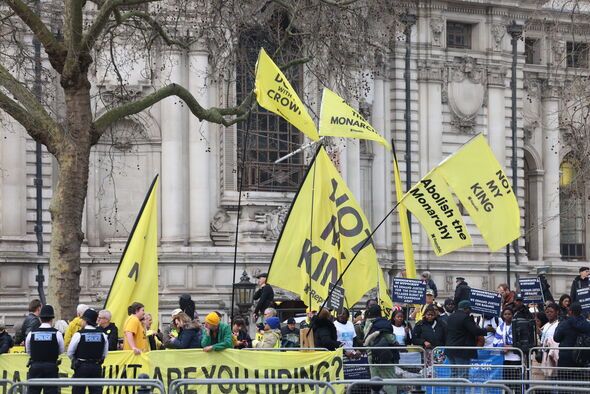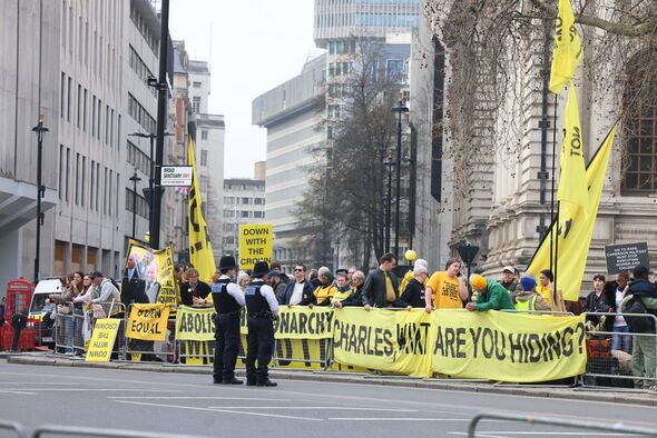 Dozens of protestors carrying bright yellow placards have begun gathering outside, chanting through a megaphone. The large Republican banners read: not my King, down with the crown, abolish the monarchy and Charles, what are you hiding?