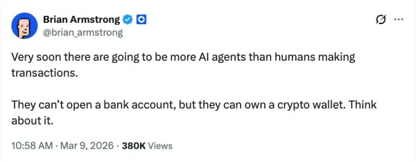 Armstrong stated in a post on X on Monday that the number of AI agents conducting transactions may soon surpass the total number of digital payment users. He pointed out that although AI systems can't access conventional bank accounts, they can function with cryptocurrency wallets.