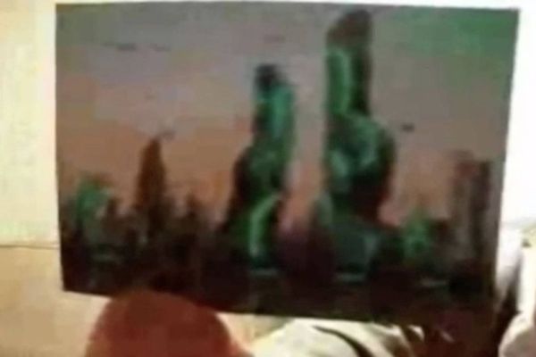 The grainy photograph seemingly depicts several towering, verdant structures with peculiar architecture.
