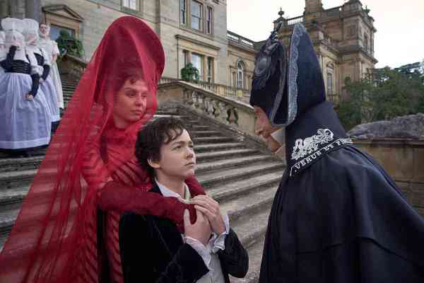 The finest costumes are worn by Mia Goth, who plays (with the aid of prosthetics) Claire, the mother of the inventor Victor Frankenstein (Oscar Isaac). The heavily pregnant Claire’s blood-red gown with a veil that flows like water is a forewarning of her death during childbirth.