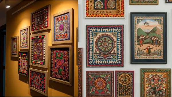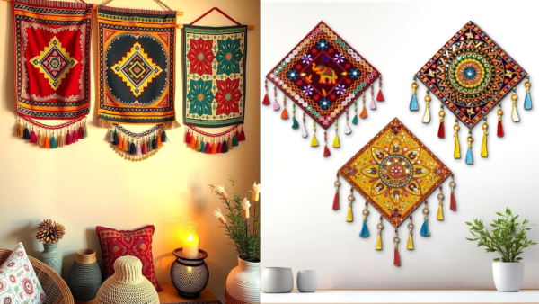 To give a vibrant look to the house, you can also make hanging wall decor from old fabric kept in the house. In this, it is hung with the help of a string, giving it a tapestry look in a triangle shape. Along with this, small tassels give it a boho look. You can make it on cotton, shoe or silk fabric. Along with this, use of mirror, colorful threads and cowries will make it even more beautiful. It can be installed in living room, puja room or low sitting area.