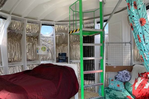 Inside, the pod has been completely transformed with silver walls, sci-fi memorabilia and lots of fun touches. It features a double bed and a set of bunk beds, so four guests can share the space, alongside an inflatable alien.