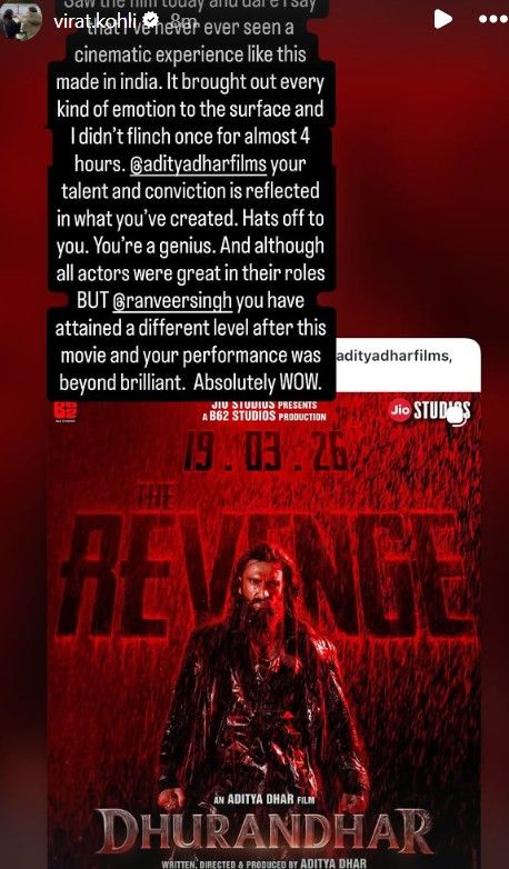Taking to his Instagram handle today, Virat Kohli called 'Dhurandhar' a "cinematic masterpiece" of India. He lauded Aditya Dhar's direction and Ranveer Singh's performance in the film.