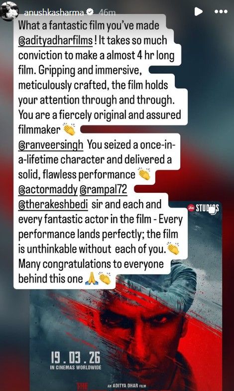 Anushka Sharma also praised the movie while lauding Aditya Dhar and Ranveer Singh.