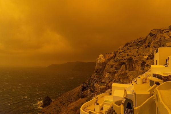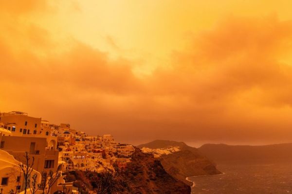 Health experts warned that higher levels of airborne particles may pose respiratory risks. Santorini's famous white-domed churches looked like a scene from a sci-fi film.