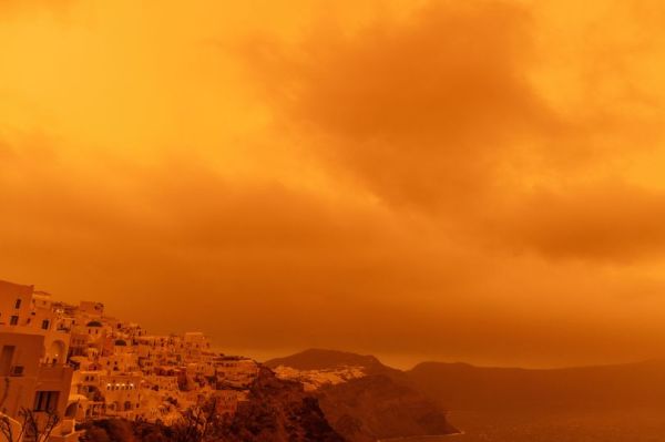 The dust carried by the storm in North Africa, around 2,300 miles from Santorini, turned the skies an eerie orange red. It caused chaos for the 15,500 permanent residents and some of the two million tourists who visit annually.